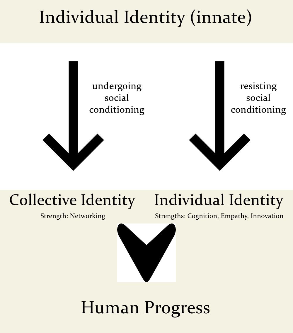 Abstract: All children are born with individual identities, but almost all of them undergo social conditioning and are forced to take on collective identities instead. Human progress is driven by people who resist social conditioning (or are not subjected to it in the first place) and retain their individual identities at the cost of being ostracised and pathologised while those who identify collectively provide the network to spread it.